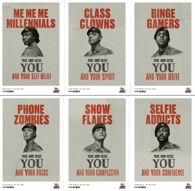 Военное министерство Великобритании создало необычную серию плакатов, призывающих записываться в армию. На них военные обращаются к «снежинкам», любителям селфи, телефонным зомби, геймерам и «ми ми ми миллениалам».