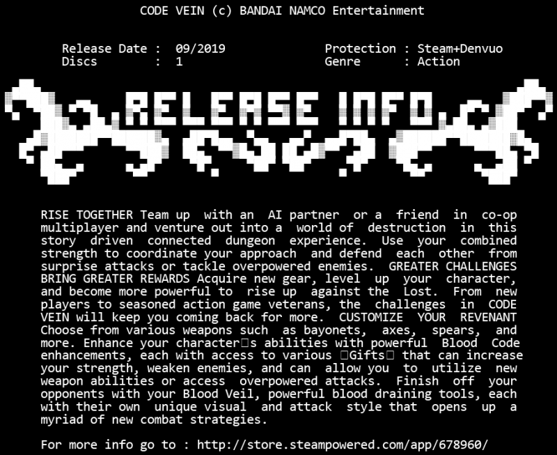 Хакерская группировка CODEX продолжает проворачивать свои темные делишки и разбивать оборону Denuvo в новых играх. В этот раз антипиратская защита пала в ролевом экшене Code Vein в стиле «Темных душ». Игру уже можно скачать с торрентов.